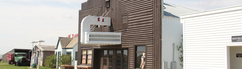 The Daniels County Museum in Scobey is one of my favorite building zoos due to its fascinating array of buildings plus the obvious care that the facility has received over the decades. When I encountered it in 1984 frankly I was amazed. Here were large buildings moved to a spot in the middle of nowhere. They did “they” hope to achieve? Of course “they” were what they were doing–and they told their story with the same verve shown by the original owners of the Rex Theater, a false front in log rustic style for a land that had so few trees.