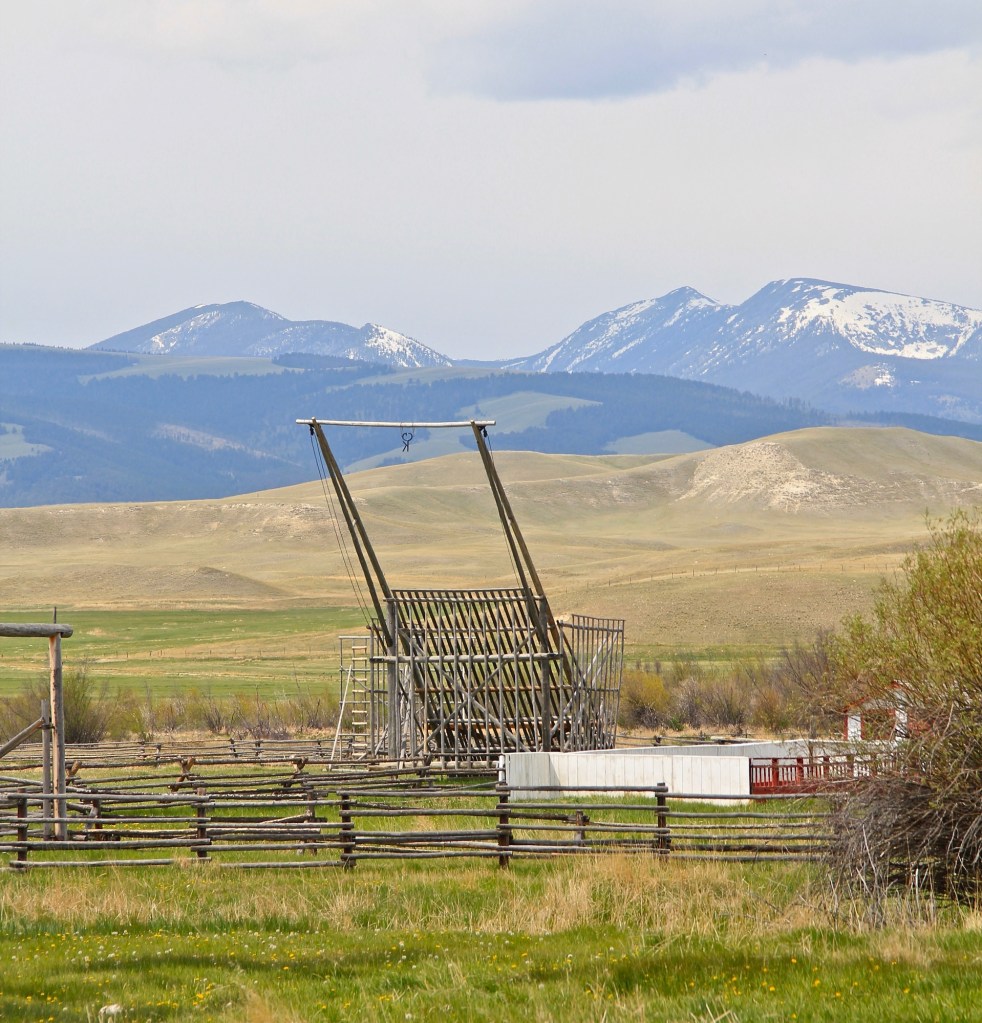 But to see the biggest concentration go to the Big Hole Valley in Beaverhead County. They were invented there in 1908. It takes two teams of horses to pull the hay up the slide and then drop it into the squarish pen, creating the hay stack.