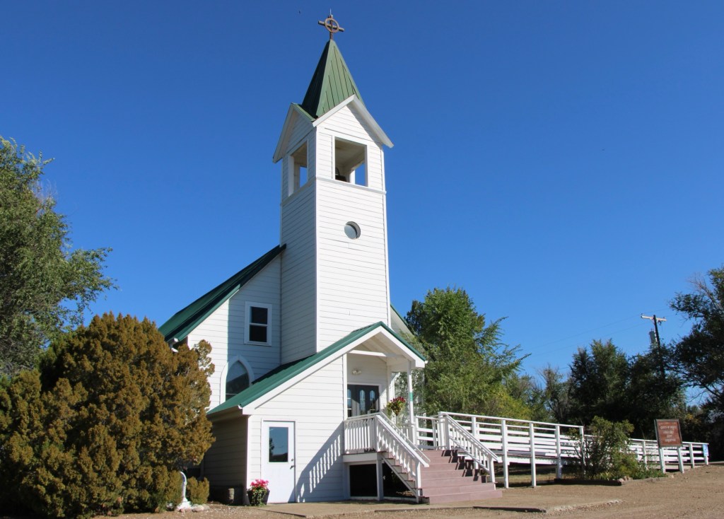Competing for the Big Sky line of Nashua is the tall Gothic style bell tower of the Catholic Church. Established in 1917, Queen of Angeles Catholic Church began as a mission church. The Sisters of Charity worked with the diocese to establish an adjacent one-room school, below, as a way of growing and maintaining the congregation after the end of the Fort Peck Dam boom.