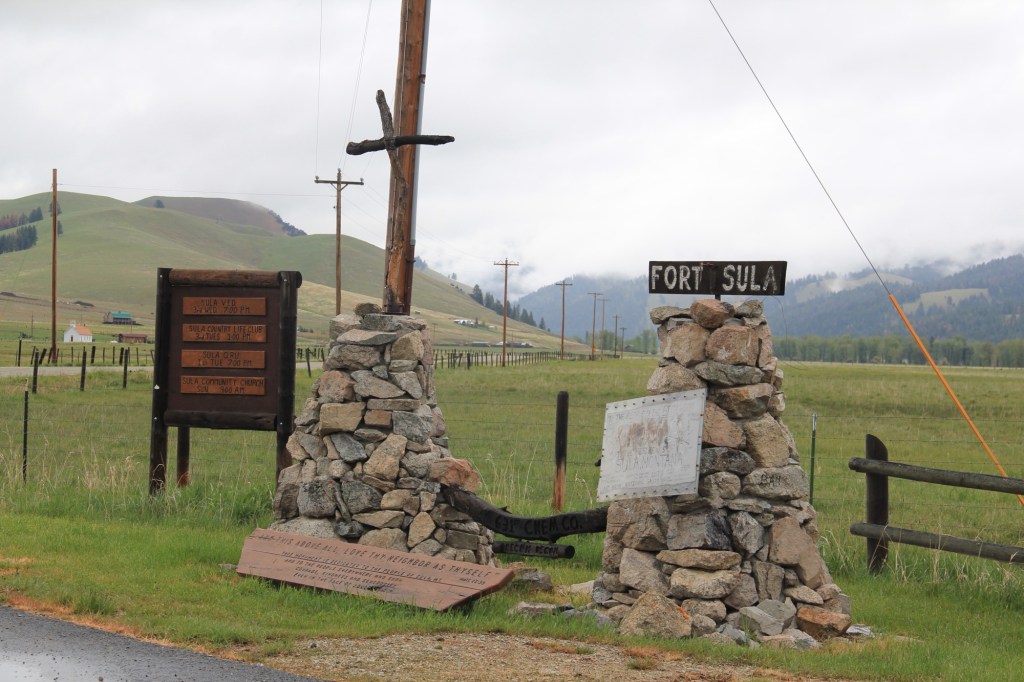 Or the interpretive marker for local history at Sula, in the state’s southwestern tip. Ranches have gotten into the act as well as seen by this wooden sign (below) about the location of Meriwether Lewis on August 12, 1805.