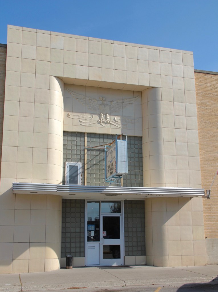 The Eagles Lodge (1948-1949) is an impressive example of late Art Deco style, especially influenced by the federal “WPA Moderne” buildings from the New Deal. G.D. Weed was the architect.