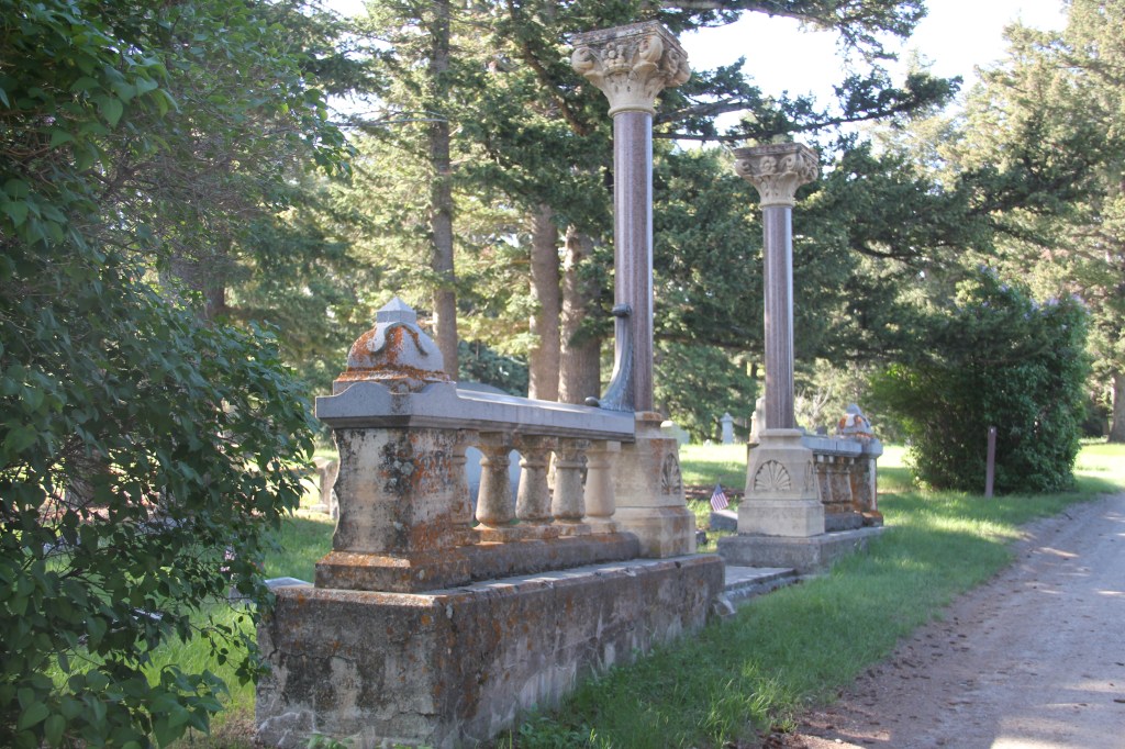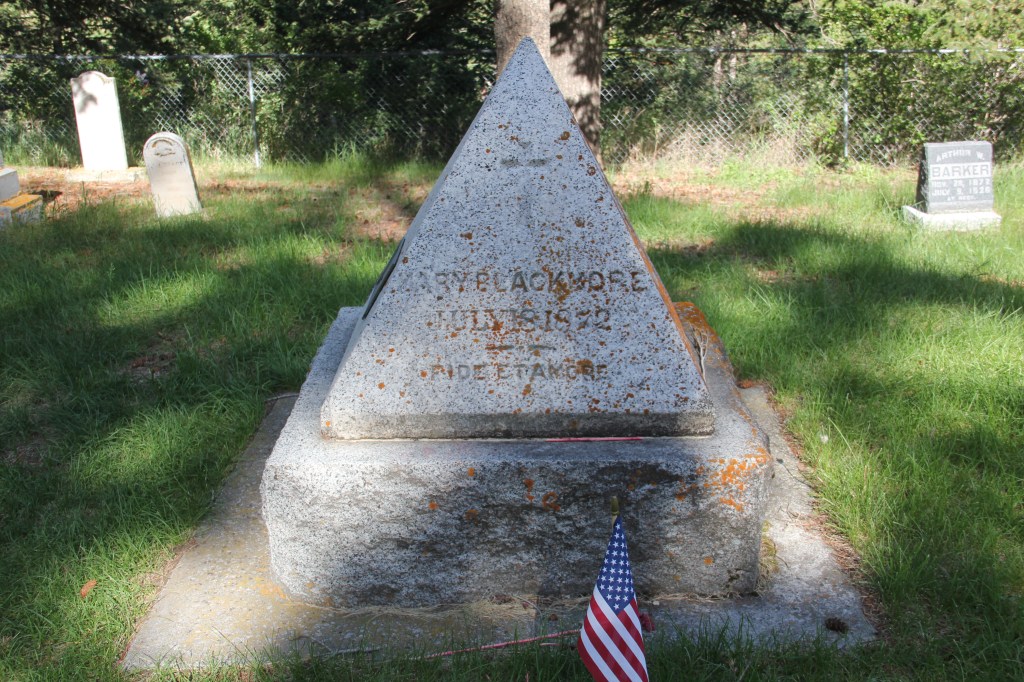 The metal plaque on the slowly decaying pyramid marker tells part of the story. Lord William Blackmore and Lady Mary Blackmore had a deep interest in the west and they came to visit newly designated Yellowstone National Park in 1872. Mary took ill and did not make the trip to the park. After her health markedly declined, citizens went to find Lord Blackmore and he returned, but Mary never recovered. Blackmore to honor his wife, and to acknowledge the support and kindness of local residents, purchased 5 acres for a public cemetery and had the pyramid marker installed. Today this oldest section of the cemetery is on the west side, The view from the Blackmore marker is impressive.