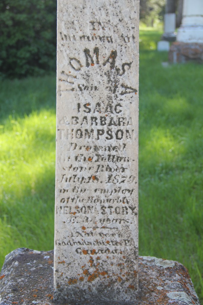You walk through an overpowering classical-staled gateway to find the graves of Story and his family. And his employees. The marker for Tom Thompson (d. 1879), the son of Isaac and Barbara, tells the story of a young man who drowned in the Yellowstone River while “in the employ of the Honorable NELSON STORY.”