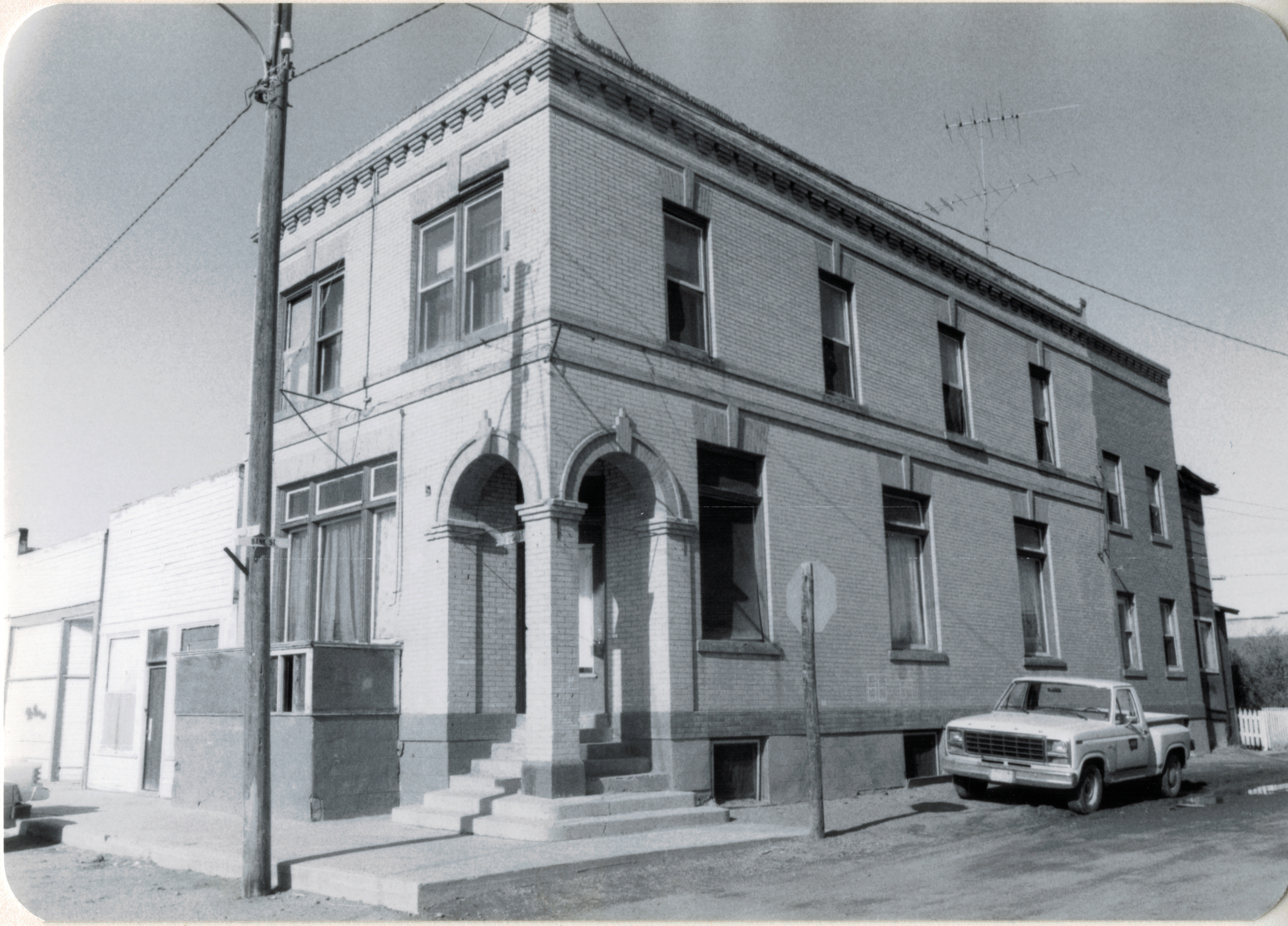 One old hotel was barely hanging on in 1984 as these two photos show. and residents wanted to keep it, but now those are gone and the block behind the bank and the commercial block have been wiped clean.